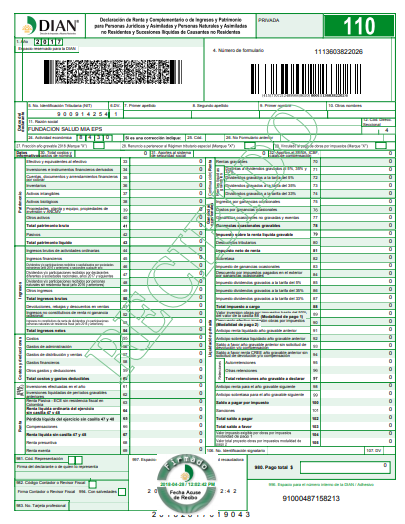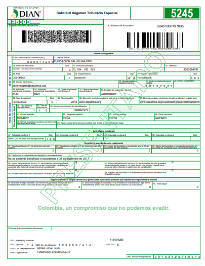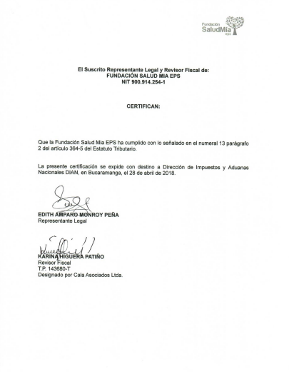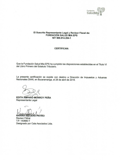 Fundación Salud Mia EPS cumplio su deber formal de presentar la declaración de renta del año gravable 2017 según formulario No 1113603822026 con fecha de presentación 28 de abril de 2018.